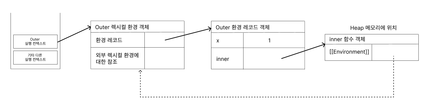 함수의 코드를 실행하기 위해서는 변수, 함수, 클래스등 식별자 정보가 필요하다. 위의 outer 함수 예시에서 return inner를 하기 위해서는 inner가 무엇인지 알고 있어야하는 것처럼 말이다. 이를 위해 outer함수의 실행컨텍스트가 생성될 때, inner가 무엇인지 기록한다. 이 외에도 x가 1이라는 것도 기록되어 있다.